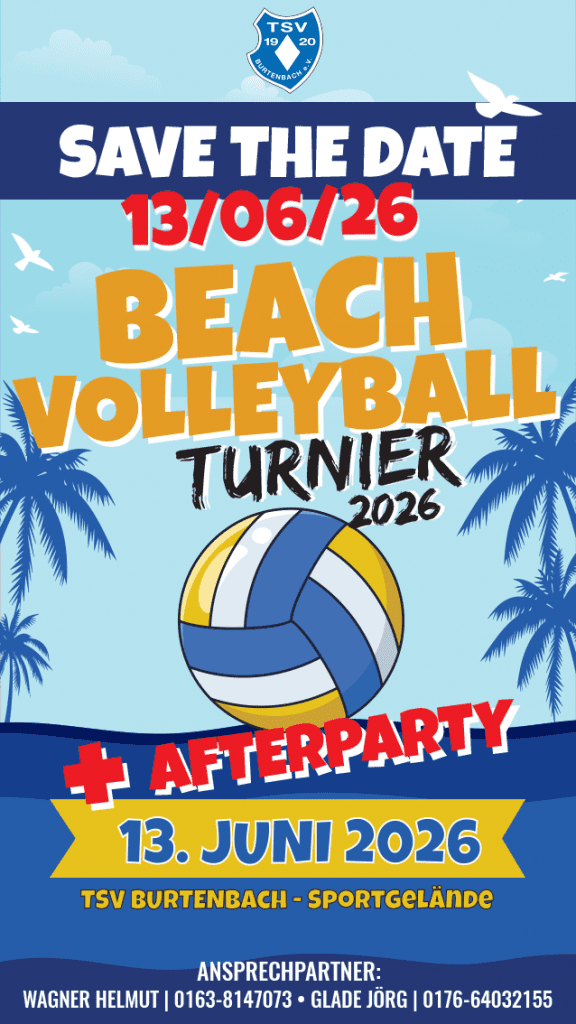 Sand unter den Füßen, Sonne im Gesicht und jede Menge gute Laune – wir, die Abteilung Tennis des TSV Burtenbach, laden euch wieder herzlich zu unserem Hobby-Beachvolleyballturnier ein!